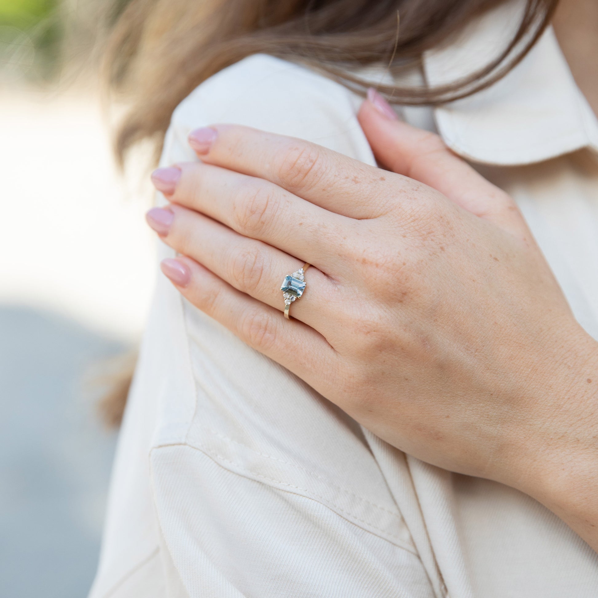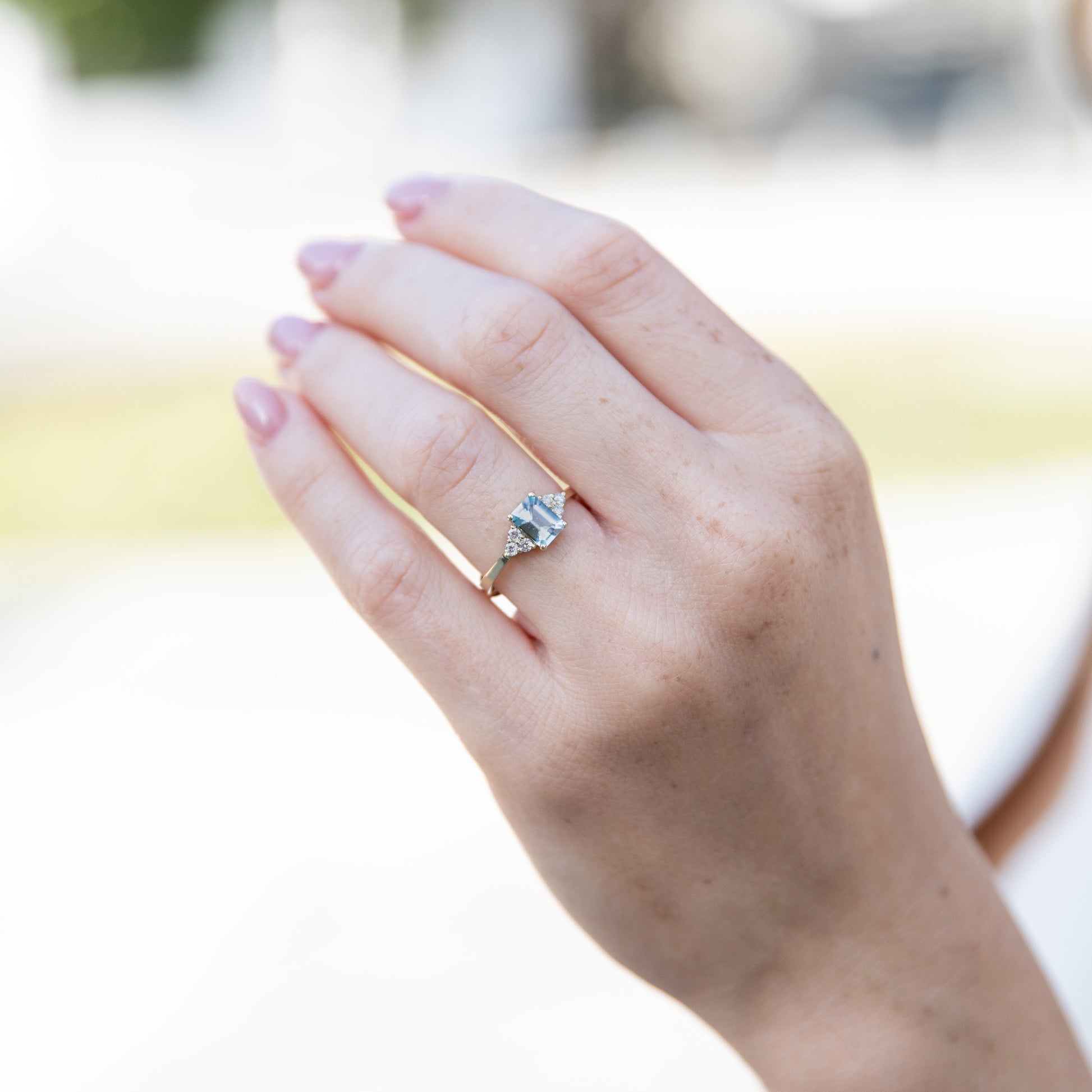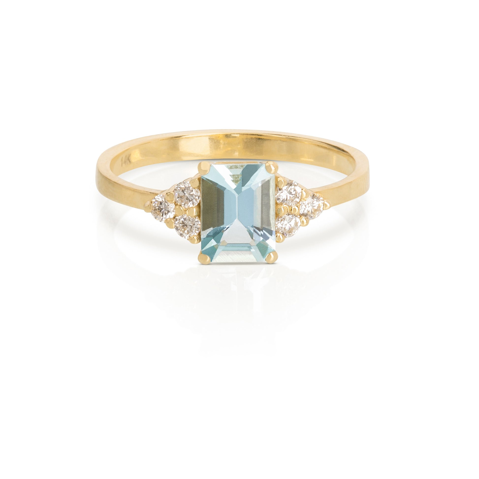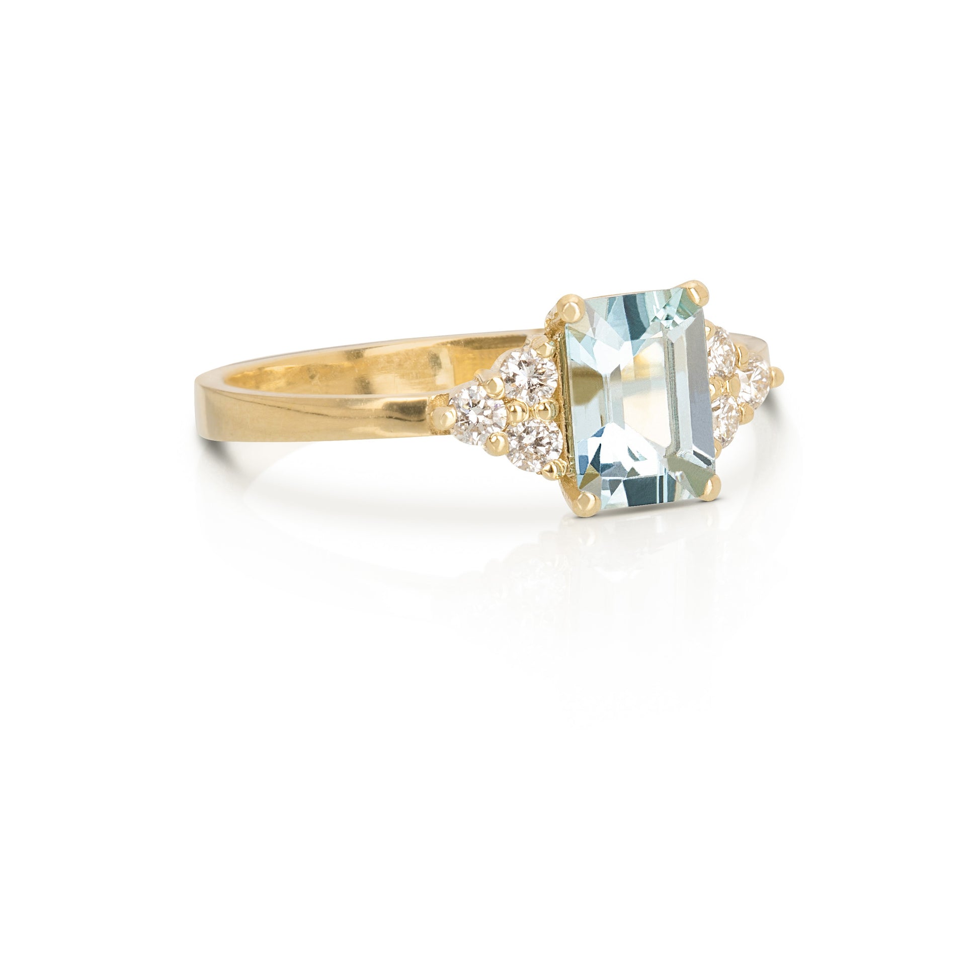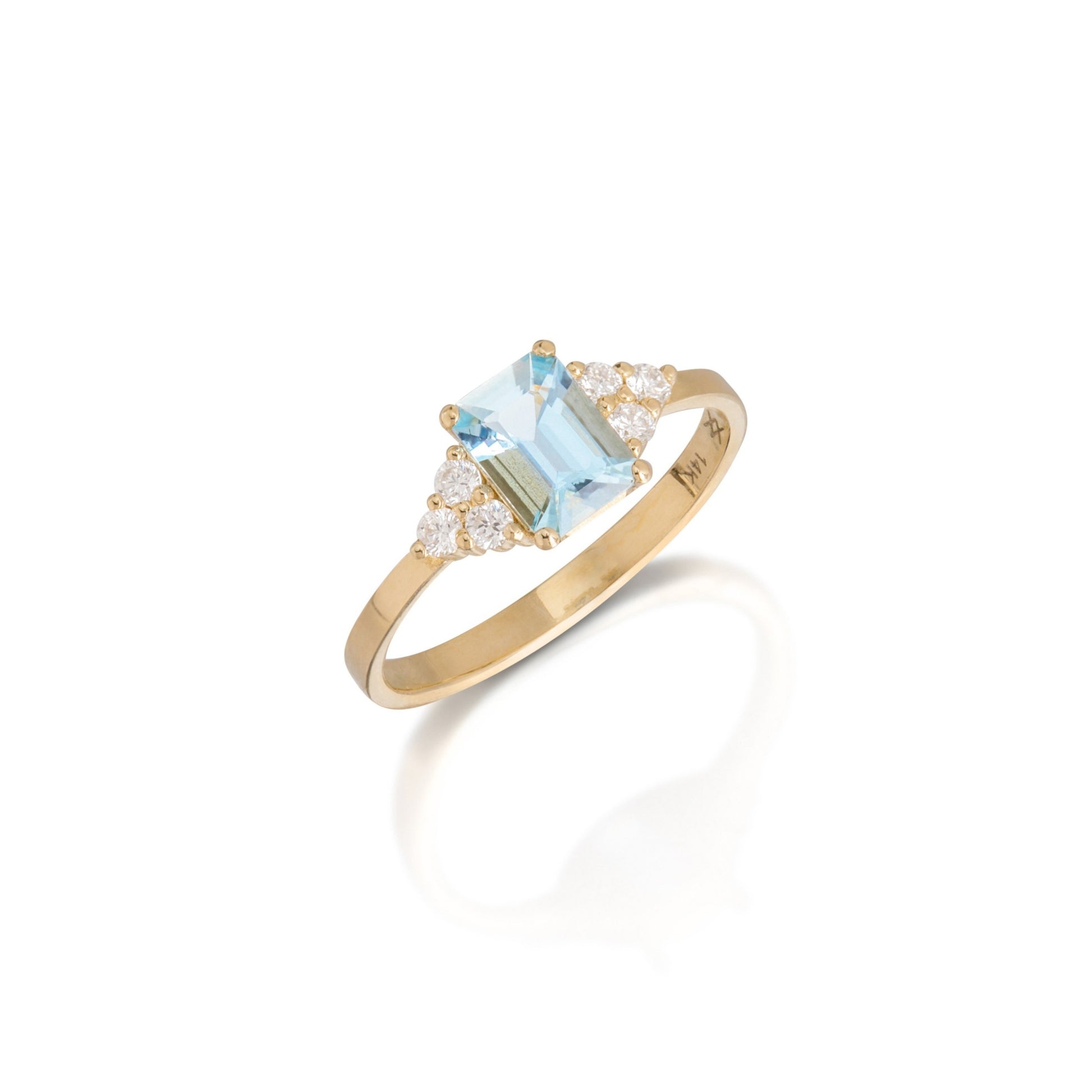 ✤Gold ring set with an emerald cut aquamarine 0.70ct, 6 white diamonds - total 0.18ct
