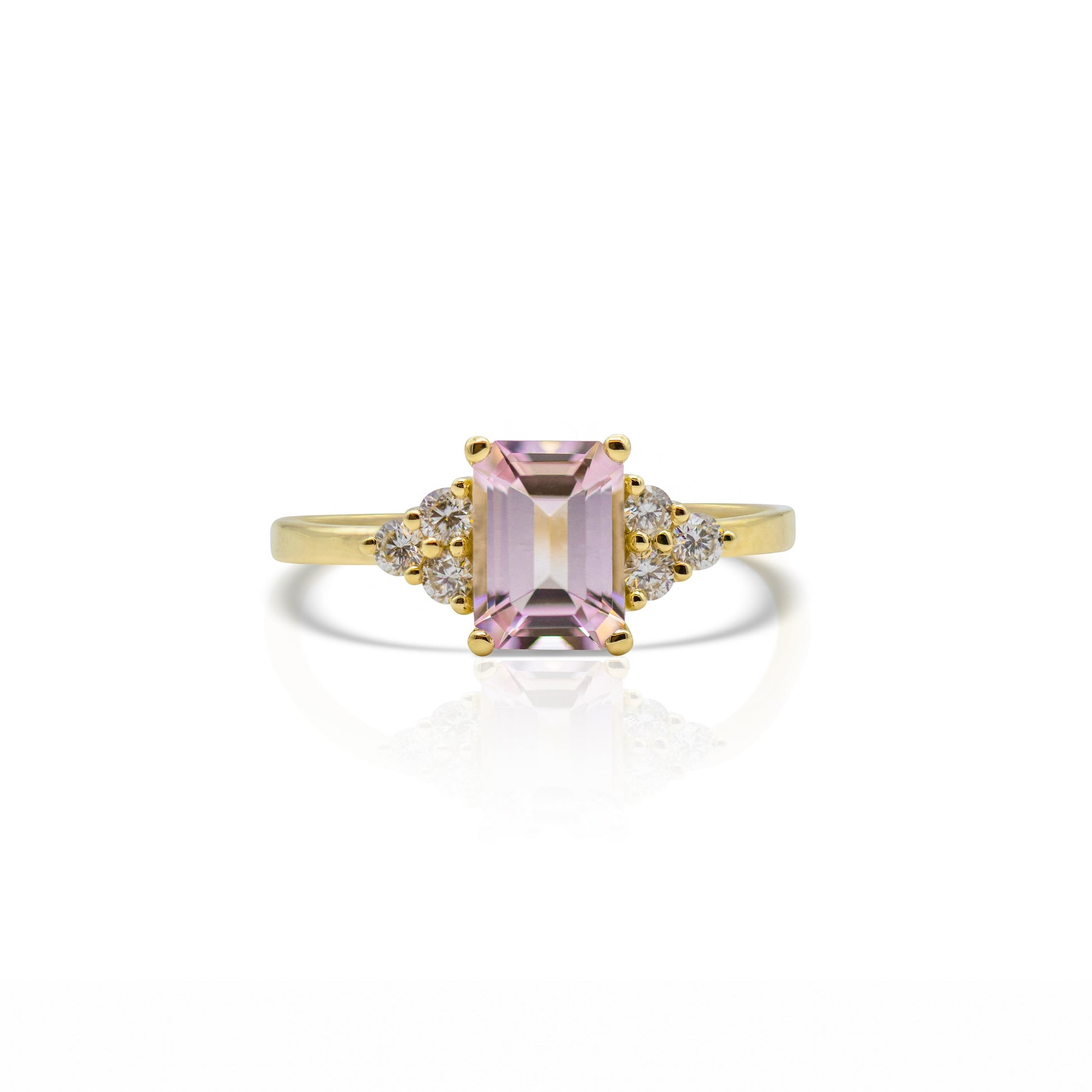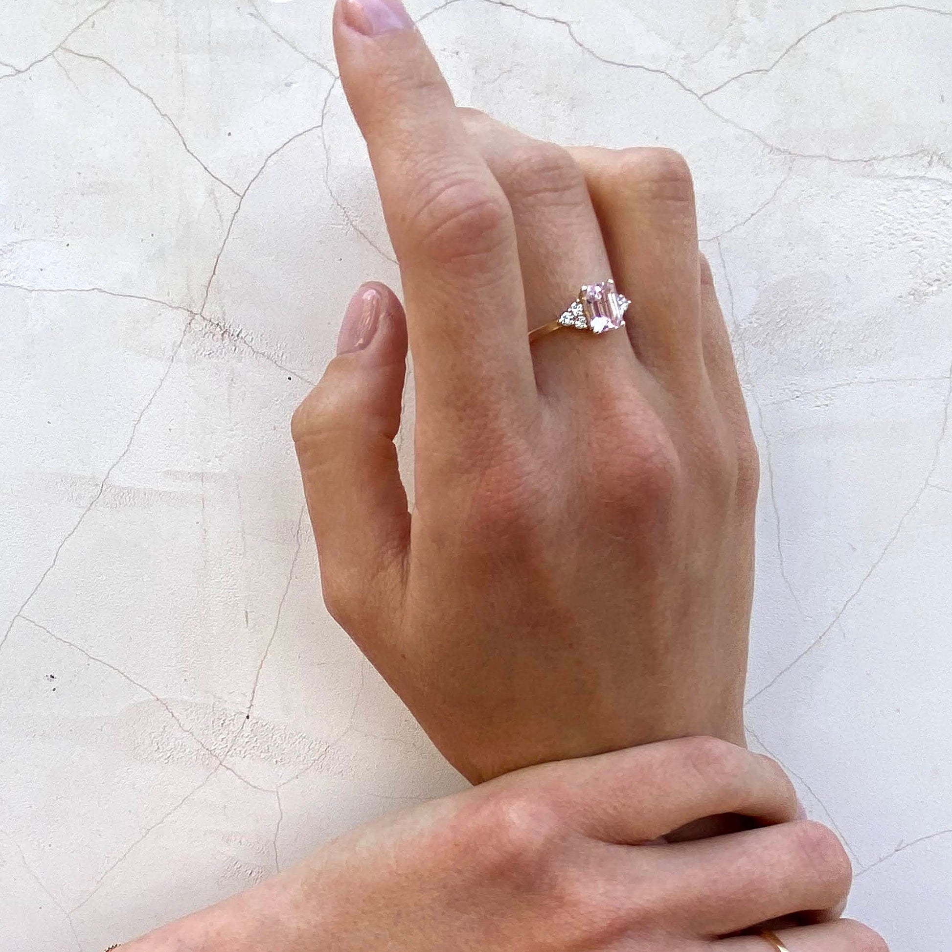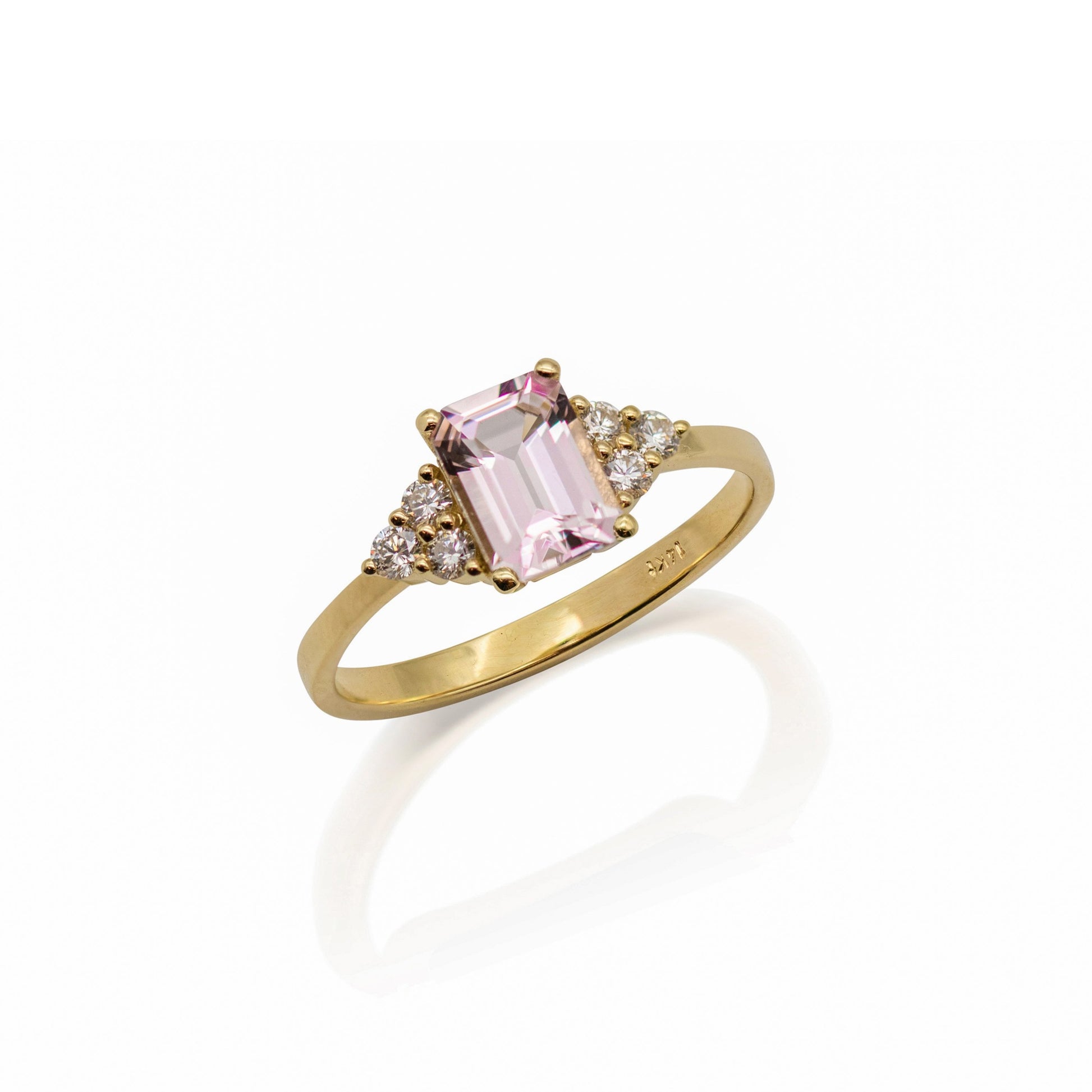 ✤Gold ring set with an emerald cut morganite 0.85ct, 6 white diamonds - total 0.18ct