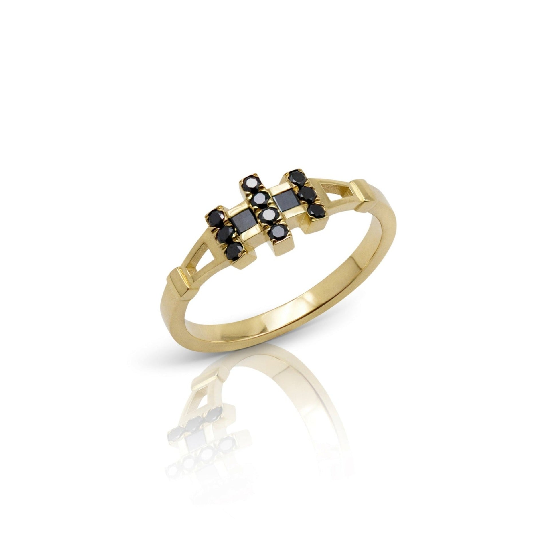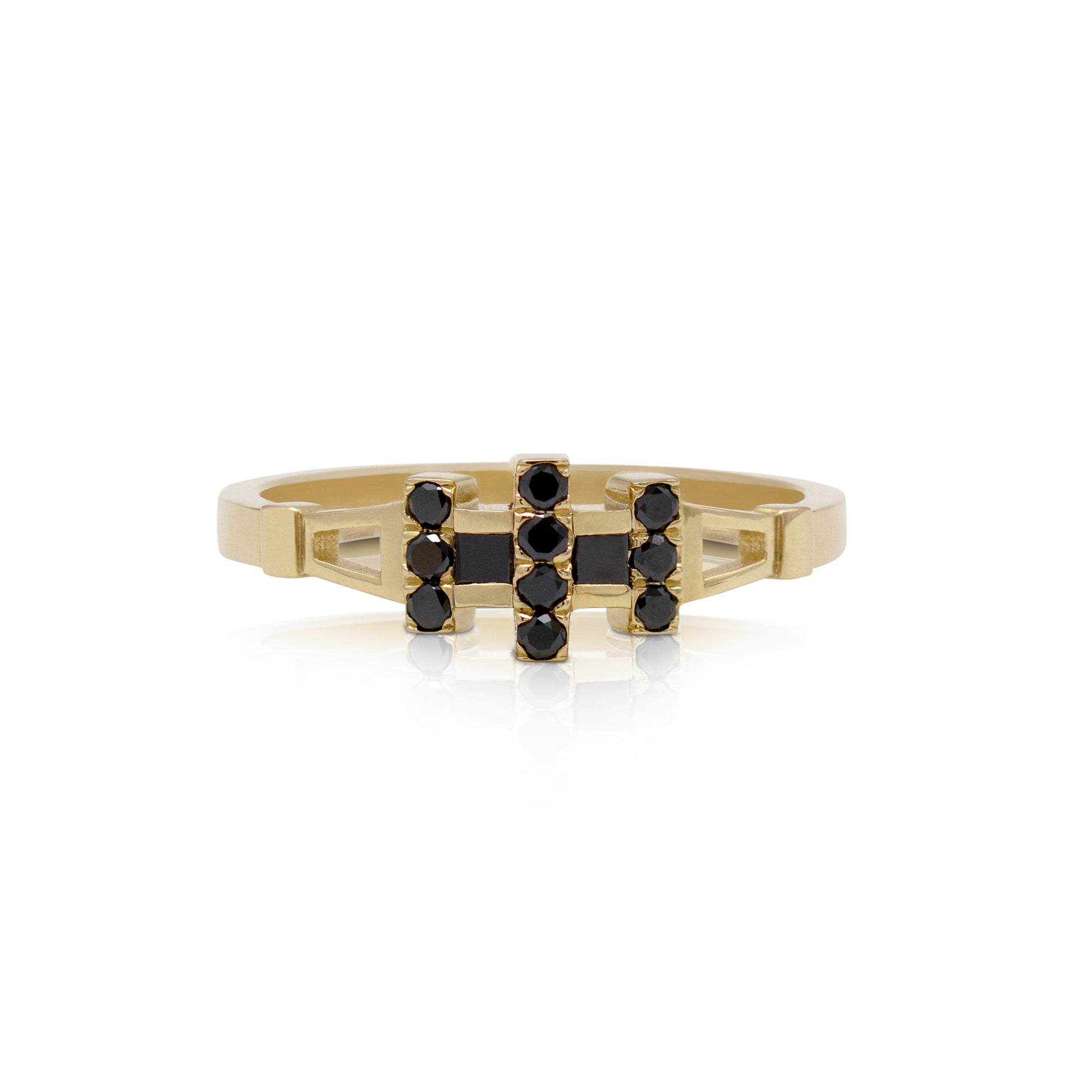 ✤Gold ring set with 2 princess cut black diamonds, 10 round cut black diamonds - total of 0.24ct