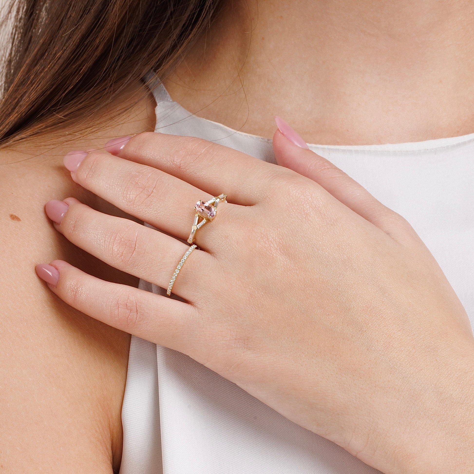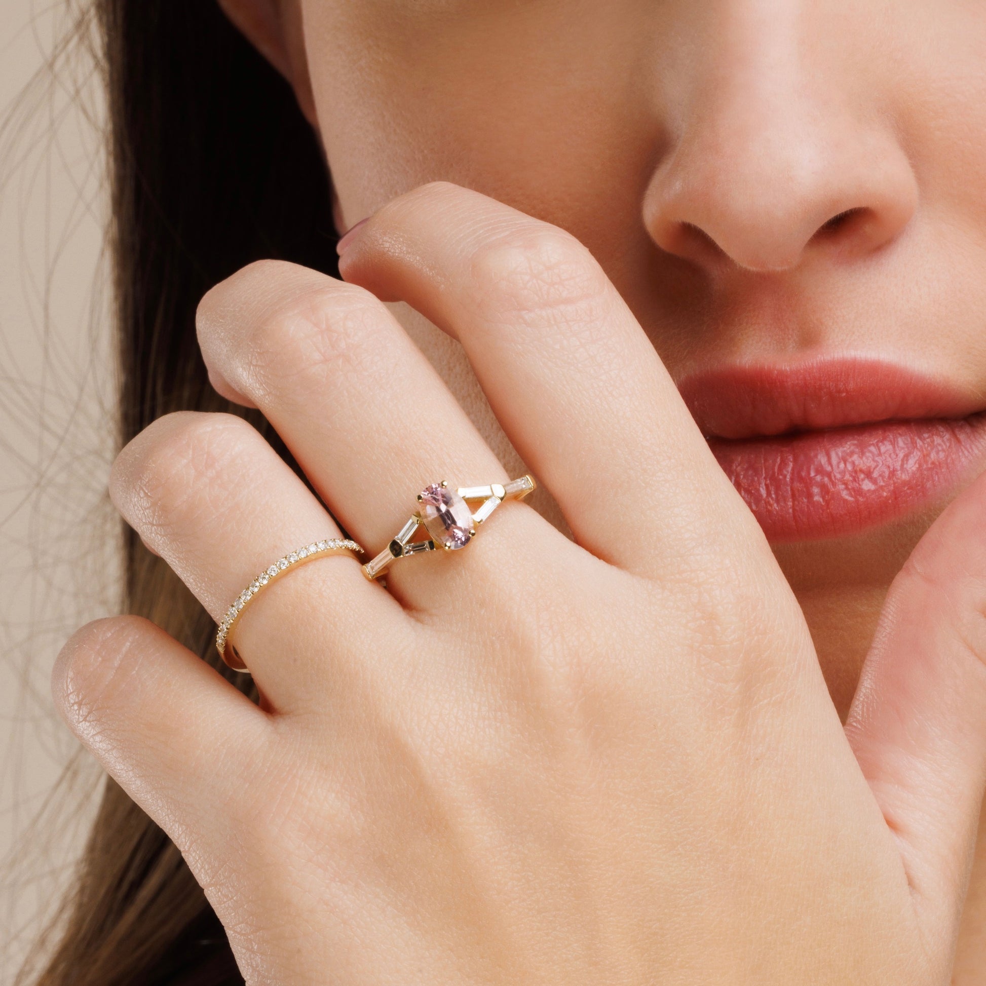 ✤Gold ring set with an oval cut morganite 0.75ct, 6 baguette cut white diamonds - total of 0.31ct